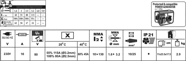 Ø 1.6 ->3.2 mm Single phase 230V – Direct Current (DC)
